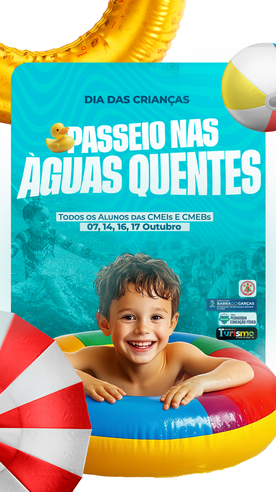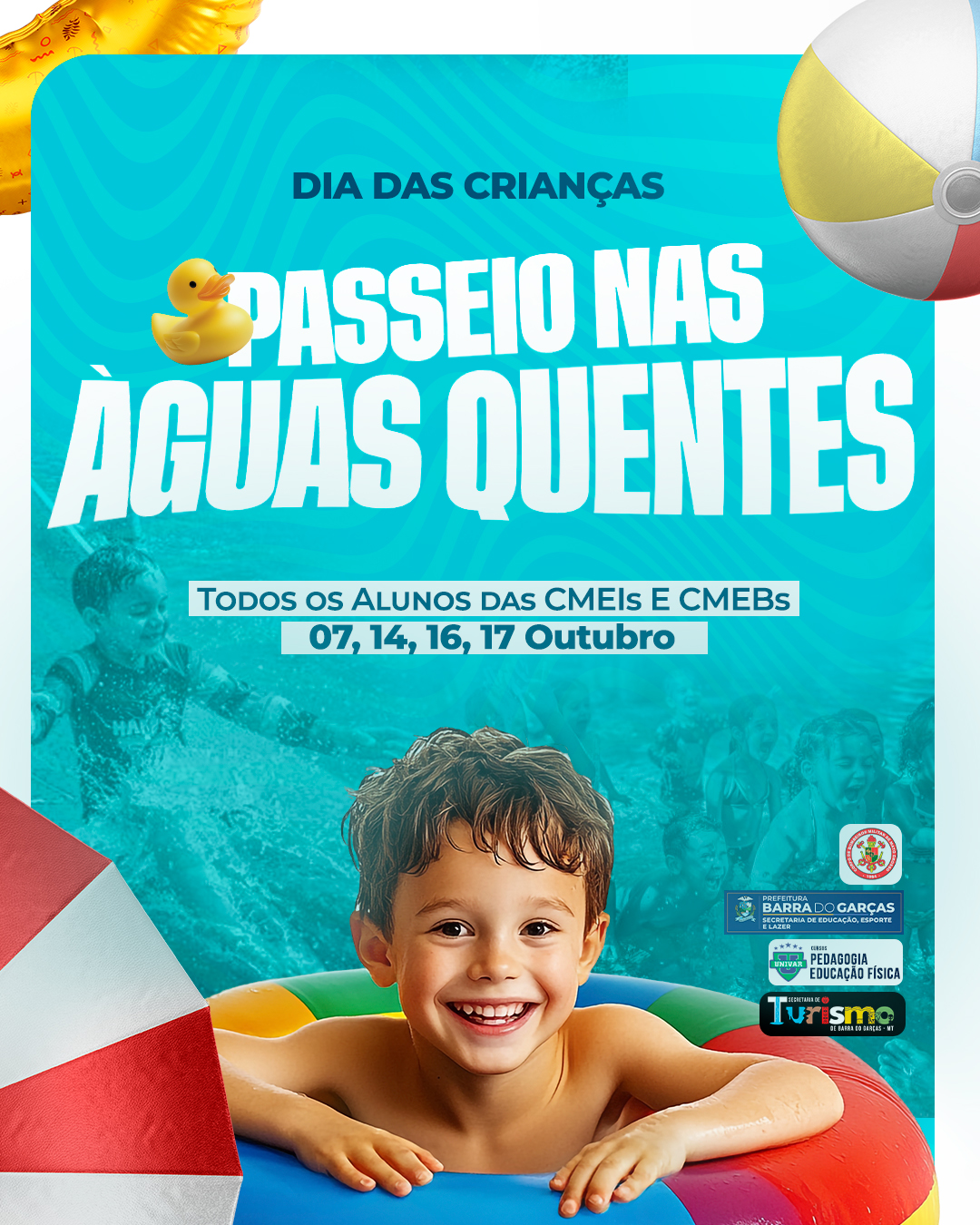 Durante os dias 07, 14, 16 e 17 de outubro, todos os alunos das CMEIs e CMEBs participarão do tradicional Passeio nas Águas Quentes, uma iniciativa que já faz parte do calendário de comemorações infantis do município.